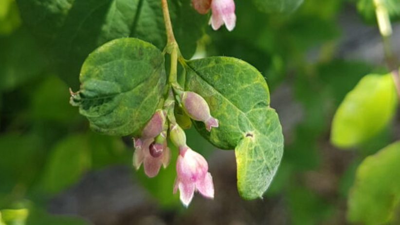 Common snowberry is a flowering shrub that is native to North America. It has oval-shaped leaves, which can have smooth or lobed edges. The flowers are small and pink and grow in clusters at the tips of stems or at the bases of leaves. The berries are large and white and are poisonous to humans and some wildlife, including fish.